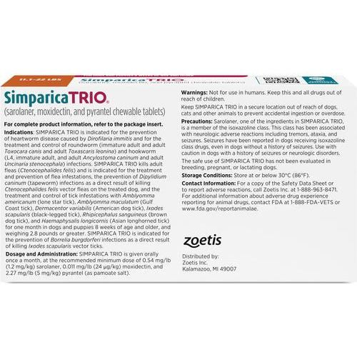 El Simparica Trio mensual previene la dirofilariosis, elimina pulgas adultas y está indicado para el tratamiento y la prevención de infestaciones por pulgas, el tratamiento y el control de infestaciones por garrapatas, y el tratamiento y el control de infecciones por ascárides y anquilostomas adultos en perros y cachorros de 8 semanas de edad o más, y que pesen 2.8 libras o más.