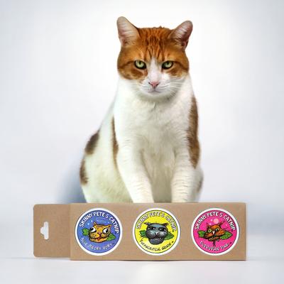 Variety is the spice of life, so give your kitty Skinny Pete's Gourmet Catnip 3-Piece Gourmet Gift Set. This three-piece gift set comes with three enticing tins of catnip—Blue Meowy Wowy, Furmaceutical Grade and Purruvian Pink. The Blue Meowy Wowy is flavored with a touch of organic spearmint leaf, the Furmaceutical Grade is unflavored, and the Purruvian Pink is flavored with a touch of organic peppermint leaf. This set also comes with a small cloth bag that may be used as a cat toy!