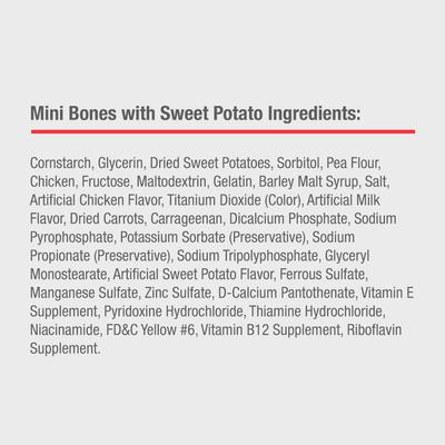 Mini Bones with Sweet Potato: Cornstarch, Glycerin, Dried Sweet Potatoes, Sorbitol, Pea Flour, Chicken, Fructose, Maltodextrin, Gelatin, Barley Malt Syrup, Salt, Artificial Chicken Flavor, Titanium Dioxide (Color), Artificial Milk Flavor, Dried Carrots, Carrageenan, Dicalcium Phosphate, Sodium Pyrophosphate, Potassium Sorbate (Preservative), Sodium Propionate (Preservative), Sodium Tripolyphosphate, Glyceryl Monostearate, Artificial Sweet Potato Flavor, Ferrous Sulfate, Manganese Sulfate, Zinc Sulfate, D-Calcium Pantothenate, Vitamin E Supplement, Pyridoxine Hydrochloride, Thiamine Hydrochloride, Niacinamide, FD&C Yellow #6, Vitamin B12 Supplement, Riboflavin Supplement.