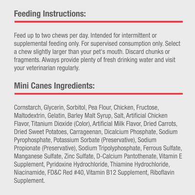 Mini Canes: Cornstarch, Glycerin, Sorbitol, Pea Flour, Chicken, Fructose, Maltodextrin, Gelatin, Barley Malt Syrup, Salt, Artificial Chicken Flavor, Titanium Dioxide (Color), Artificial Milk Flavor, Dried Carrots, Dried Sweet Potatoes, Carrageenan, Dicalcium Phosphate, Sodium Pyrophosphate, Potassium Sorbate (Preservative), Sodium Propionate (Preservative), Sodium Tripolyphosphate, Ferrous Sulfate, Manganese Sulfate, Zinc Sulfate, D-Calcium Pantothenate, Vitamin E Supplement, Pyridoxine Hydrochloride, Thiamine Hydrochloride, Niacinamide, FD&C Red #40, Vitamin B12 Supplement, Riboflavin Supplement.
