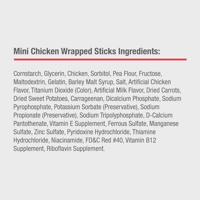 Mini Chicken Wrapped Sticks: Cornstarch, Glycerin, Chicken, Sorbitol, Pea Flour, Fructose, Maltodextrin, Gelatin, Barley Malt Syrup, Salt, Artificial Chicken Flavor, Titanium Dioxide (Color), Artificial Milk Flavor, Dried Carrots, Dried Sweet Potatoes, Carrageenan, Dicalcium Phosphate, Sodium Pyrophosphate, Potassium Sorbate (Preservative), Sodium Propionate (Preservative), Sodium Tripolyphosphate, D-Calcium Pantothenate, Vitamin E Supplement, Ferrous Sulfate, Manganese Sulfate, Zinc Sulfate, Pyridoxine Hydrochloride, Thiamine Hydrochloride, Niacinamide, FD&C Red #40, Vitamin B12 Supplement, Riboflavin Supplement.