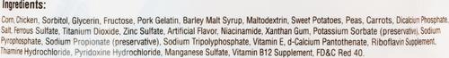 Corn, Chicken, Sorbitol, Glycerin, Fructose, Pork Gelatin, Barley Malt Syrup, Maltodextrin, Sweet Potatoes, Peas, Carrots, Dicalcium Phosphate, Salt, Ferrous Sulfate, Titanium Dioxide, Zinc Sulfate, Artificial Flavor, Niacinamide, Xanthan Gum, Potassium Sorbate (Preservative), Sodium Pyrophosphate, Sodium Propionate (Preservative), Sodium Tripolyphosphate, Vitamin E, D-Calcium Pantothenate, Riboflavin Supplement, Thiamine Hydrochloride, Pyridoxine Hydrochloride, Manganese Sulfate, Vitamin B12 Supplement, FD&C Red 40. Vitamins & Minerals: Ferrous Sulfate, Zinc Sulfate, Niacin, (Niacinamide, Vitamin E, D-Calcium Pantothenate, Riboflavin Supplement, Thiamine Hydrochloride, Pyridoxine Hydrochloride, Manganese Sulfate, Vitamin B12 Supplement.