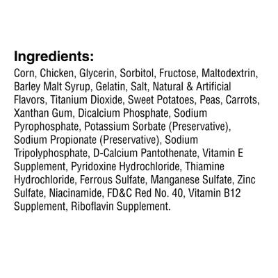 Corn, Chicken, Glycerin, Sorbitol, Fructose, Maltodextrin, Barley Malt Syrup, Gelatin, Salt, Natural & Artificial Flavors, Titanium Dioxide, Sweet Potatoes, Peas, Carrots, Xanthan Gum, Dicalcium Phosphate, Sodium Pyrophosphate, Potassium Sorbate (Preservative), Sodium Propionate (Preservative), Sodium Tripolyphophate, D-Calcium Pantothenate, Vitamin E Supplement, Pyridoxine Hydrochloride, Thiamine Hydrochloride, Ferrous Sulfate, Manganese Sulfate, Zinc Sulfate, Niacinamide, FD&C Red No. 40, Vitamin B12 Supplement, Riboflavin Supplement.