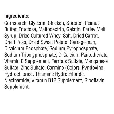Cornstarch, Glycerin, Chicken, Sorbitol, Peanut Butter, Fructose, Maltodextrin, Gelatin, Barley Malt Syrup, Dried Cultured Whey, Salt, Dried Carrot, Dried Peas, Dried Sweet Potato, Carrageenan, Dicalcium Phosphate, Sodium Pyrophosphate, Sodium Tripolyphosphate, D-Calcium Panthothenate, Vitamin E Supplement, Ferrous Sulfate, Manganese Sulfate, Zinc Sulfate, Carmine (Color), Pyridoxine Hydrochloride, Thiamine Hydrochloride, Niacinamide, Vitamin B12 Supplement, Riboflavin Supplement