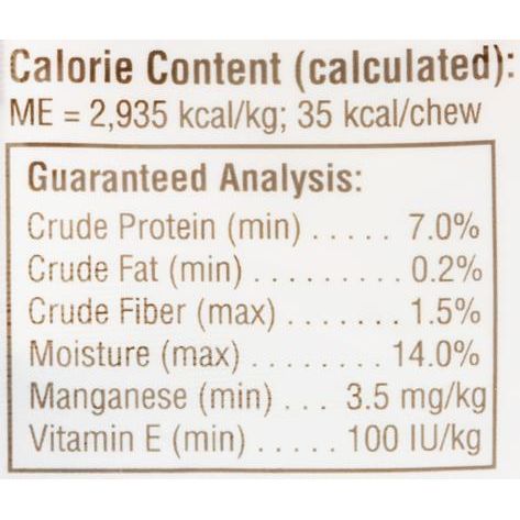 Maíz, pollo, sorbitol, glicerina, fructosa, Gelatina de cerdo, mantequilla de cacahuete, jarabe de malta de cebada, maltodextrina, boniatos, guisantes, zanahorias, fosfato dicálcico, sal, sulfato ferroso, dióxido de titanio (colorante artificial), sulfato de zinc, saborizante artificial, niacinamida, goma xantana, sorbato de potasio (conservante), pirofosfato de sodio, propionato de sodio (conservante), tripolifosfato de sodio, suplemento de vitamina E, pantotenato de calcio, suplemento de riboflavina, clorhidrato de tiamina, clorhidrato de piridoxina, sulfato de manganeso, suplemento de vitamina B12, FD&C rojo 40.