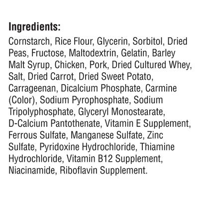 Cornstarch, Rice Flour, Glycerin, Chicken, Pork, Sorbitol, Fructose, Maltodextrin, Gelatin, Barley Malt Syrup, Dried Cultured Whey, Salt, Dried Carrot, Dried Peas, Dried Sweet Potato, Carrageenan, Dicalcium Phosphate, Sodium Pyrophosphate, Sodium Tripolyphosphate, Glyceryl Momostearate, D-Calcium Panthothenate, Vitamin E Supplement, Ferrous Sulfate, Manganese Sulfate, Zinc Sulfate, Carmine (Color), Pyridoxine Hydrochloride, Thiamine Hydrochloride, Niacinamide, Vitamin B12 Supplement, Riboflavin Supplement