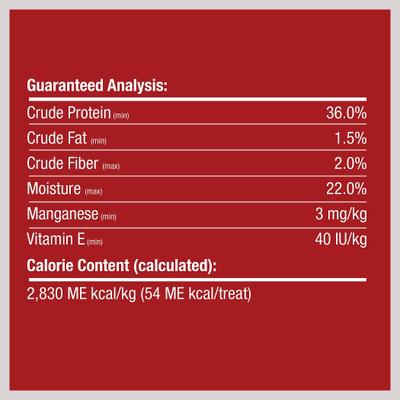 Chicken, Potato Starch, Glycerin, Pea Protein, Peanut Butter, Beef, DriedSweet Potato, Dried Carrot, Soy Flour, Sorbitol, Natural Peanut Flavor,Carrageenan, Mixed Tocopherols (Preservative), Manganese Sulfate,Cochineal Extract.