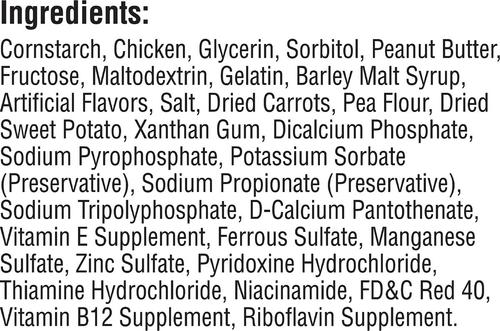 Cornstarch, Glycerin, Chicken, Sorbitol, Peanut Butter, Fructose, Maltodextrin, Gelatin, Barley Malt Syrup, Salt, Artificial Flavors, Dried Carrots, Pea Flour, Dried Sweet Potatoes, Xanthan Gum, Dicalcium Phosphate, Sodium Pyrophosphate, Potassium Sorbate (Preservative), Sodium Propionate (Preservative), Sodium Tripolyphosphate, D-Calcium Pantothenate, Vitamin E Supplement, Ferrous Sulfate, Manganese Sulfate, Zinc Sulfate, Pyridoxine Hydrochloride, Niacinamide, FD&C Red #40, Vitamin B12 Supplement, Riboflavin Supplement