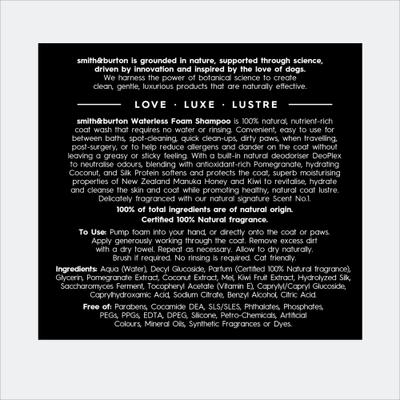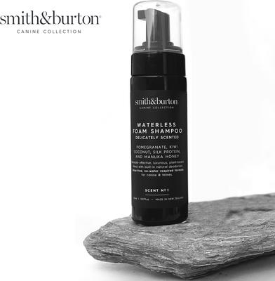 The smith&burton Canine Collection Dog & Cat Waterless Foam Shampoo is a natural, nutrient-rich coat wash that requires no water or rinsing. It’s crafted with quality, plant-based ingredients and no nasties. The luxurious, creamy foam is also handy and easy to use for everyday spot-cleaning, quick cleanups, dirty paws, and more. Use it when traveling, post-surgery, or to help reduce allergens and dander on the coat without leaving a greasy or sticky feeling. The built-in powerful natural deodorizer neutralizes the toughest odors, blending with antioxidant-rich pomegranate, hydrating coconut, and silk protein to help soften and protect the coat. This shampoo combines New Zealand manuka honey, known for its natural antibacterial and moisturizing properties, and nourishing kiwi with added vitamin E for optimal skin and coat health. This expertly crafted blend revitalizes, moisturizes, and cleanses the skin and coat while promoting healthy, natural coat luster.