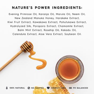 Evening Primrose Oil, Karanja Oil, Marula Oil, Neem Oil, New Zealand Manuka Honey, Harakeke Extract, Kiwi Fruit Extract, Kawakawa Extract, Pohutukawa Extracts, Hydrolyzed Silk, Poroporo Extract, Chamomile Extract, Balm Mint Extract, Rosehip Oil, Kakadu Oil, Calendula Extract, Aloe Vera Extract, Soybean Oil.