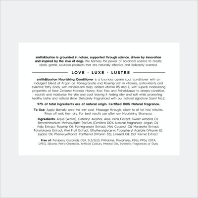 With the smith&burton Nourishing Dog & Cat Conditioner, Scent No.2, you can support and nourish your furbaby’s coat health. This luxurious blend features the finest quality plant based ingredients—no nasties here! Argan oil, pomegranate, rosehip and kelp provide vitamins, antioxidants and essential fatty acids to support a healthier coat. New Zealand manuka honey, flax and Pohutukawa offer deep moisturizing to nourish the coat and add paw-some volume. The moisturizer helps to protect the coat, prevent damage and make the hair smoother, more manageable and shinier. It’s infused with the natural fragrance Scent No.2, which is a delicate, sweet scent.
