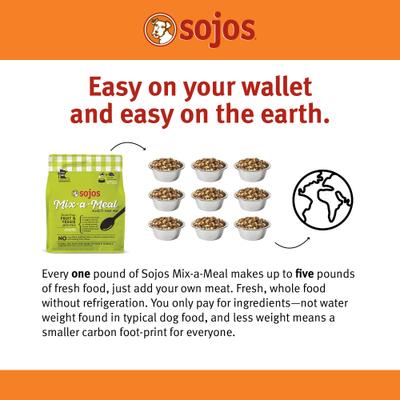 Get flavorful, fresh food fast with Sojos Mix-a-Meal Fruit & Veggie Pre-Mix Dog Food. As convenient as normal kibble, this dry mix packs the nutritional value you can only get from raw ingredients. When mixed with water, the shelf stable, freeze-dried food transforms into a tasty, wholesome meal. It also contains no preservatives, artificial ingredients, grains, or fillers. Sojos makes a raw diet achievable and enjoyable for your furry foodie!