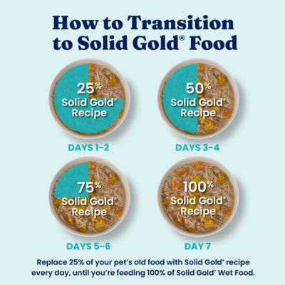Switching to any new dog food should be a gradual transition over 7 to 10 days. Replace 25% of the current food with Solid Gold for 2 to 3 days, then feed a little more Solid Gold over the next 5 to 7 days until they are eating Solid Gold exclusively. This gradual transition will help reduce any digestive upsets that may occur due to changes in diet.