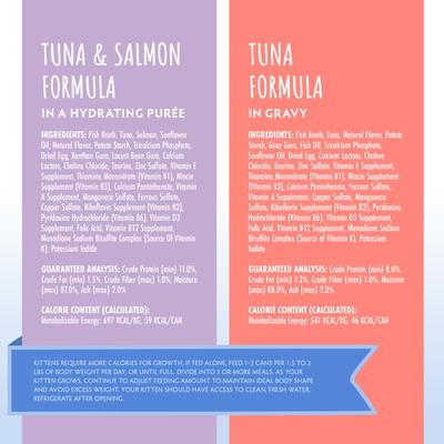 Tuna & Salmon Formula In Hydrating Purée: Fish Broth, Tuna, Salmon, Sunflower Oil, Natural Flavor, Potato Starch, Tricalcium Phosphate, Dried Egg, Xanthan Gum, Locust Bean Gum, Calcium Lactate, Choline Chloride, Taurine, Zinc Sulfate, Vitamin E Supplement, Thiamine Mononitrate (Vitamin B1), Niacin Supplement (Vitamin B3), Calcium Pantothenate, Vitamin A Supplement, Manganese Sulfate, Ferrous Sulfate, Copper Sulfate, Riboflavin Supplement (Vitamin B2), Pyridoxine Hydrochloride (Vitamin B6), Vitamin D3 Supplement, Folic Acid, Vitamin B12 Supplement, Menadione Sodium Bisulfite Complex (Source Of Vitamin K), Potassium Iodide.