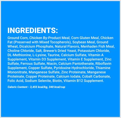 Ground Corn, Chicken By-Product Meal, Corn Gluten Meal, Chicken Fat (Preserved with Mixed Tocopherols), Soybean Meal, Ground Wheat, Dicalcium Phosphate, Natural Flavors, Menhaden Fish Meal, Choline Chloride, Salt, Brewer’s Dried Yeast, Potassium Chloride, DL-Methionine, L-Lysine, Taurine, Calcium Sulfate, Vitamin A Supplement, Vitamin D3 Supplement, Vitamin E Supplement, Zinc Sulfate, Ferrous Sulfate, Niacin, Calcium Pantothenate, Riboflavin Supplement, Copper Sulfate, Pyridoxine Hydrochloride, Thiamine Mononitrate, Manganese Sulfate, Zinc Proteinate, Manganese Proteinate, Copper Proteinate, Calcium Iodate, Cobalt Carbonate, Folic Acid, Sodium Selenite, Biotin, Vitamin B12 Supplement.