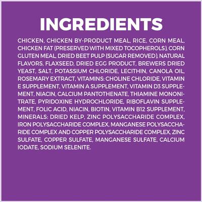 Chicken By-Product Meal, Rice, Corn Meal, Chicken Fat (Preserved With Mixed Tocopherols), Corn Gluten Meal, Dried Beet Pulp (Sugar Removed), Natural Flavors, Flaxseed, Dried Egg Product, Brewers Dried Yeast, Salt, Potassium Chloride, Lecithin, Canola Oil, Rosemary Extract, Vitamins: Choline Chloride, Vitamin E Supplement, Vitamin A Supplement, Vitamin D3 Supplement, Niacin, Calcium Pantothenate, Thiamine Mononitrate (Source Of Vitamin B1), Pyridoxine Hydrochloride (Source Of Vitamin B6), Riboflavin Supplement, Folic Acid, Niacin, Biotin, Vitamin B12 Supplement, Chondroitin Sulfate, Minerals: Dried Kelp, Zinc Polysaccharide Complex, Iron Polysaccharide Complex, Manganese Polysaccharide Complex And Copper Polysaccharide Complex, Zinc Sulfate, Copper Sulfate, Manganese Sulfate, Calcium Iodate, Cobalt Carbonate, Sodium Selenite.