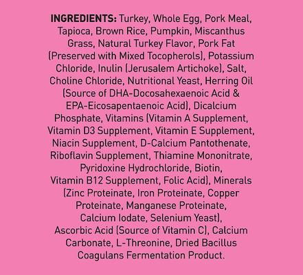Turkey, Whole Egg, Pork Meal, Tapioca, Brown Rice, Pumpkin, Miscanthus Grass, Natural Turkey Flavor, Pork Fat (Preserved with Mixed Tocopherols), Potassium Chloride, Dicalcium Phosphate, Inulin (Jerusalem Artichoke), Salt, Choline Chloride, Nutritional Yeast, Herring Oil (Source of DHA-Docosahexaenoic Acid & EPA-Ecosapentaenoic Acid), Vitamins (Vitamin A Supplement, Vitamin D3 Supplement, Vitamin E Supplement, Niacin Supplement, D-Calcium Pantothenate, Riboflavin Supplement, Thiamine Mononitrate, Pyridoxine Hydrochloride, Biotin, Vitamin B12 Supplement), Minerals (Zinc Proteinate, Iron Proteinate, Copper Proteinate, Manganese Proteinate, Calcium Iodate, Selenium Yeast), Ascorbic Acid (Source of Vitamin C), Calcium Carbonate, L-Threonine, Dried Bacillus Coagulans Fermentation Product.
