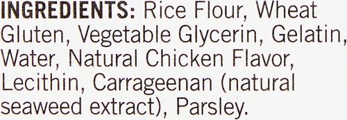 Rice flour, wheat gluten, vegetable glycerin, gelatin, water, natural chicken flavor, lecithin, carrageenan (natural seaweed extract), parsley