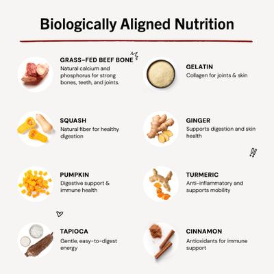 Beef bone broth, squash, pumpkin, tapioca, gelatin, ginger, turmeric, cinnamon.