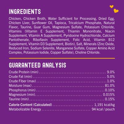 Pollo, caldo de pollo, agua suficiente para procesar, huevo deshidratado, hígado de pollo, aceite de girasol, tapioca, fosfato tricálcico, sabor natural, taurina, goma guar, sulfato de magnesio, cloruro de potasio, vitaminas (suplemento de vitamina E, mononitrato de tiamina, suplemento de niacina, suplemento de vitamina A, clorhidrato de piridoxina, pantotenato de d-calcio, suplemento de riboflavina, ácido fólico, suplemento de vitamina B12, suplemento de vitamina D3, biotina), sal, minerales (óxido de zinc, Hierro reducido, selenito de sodio, sulfato de manganeso, complejo de aminoácidos de cobre, yoduro de potasio, sulfato de cobre), cloruro de colina.