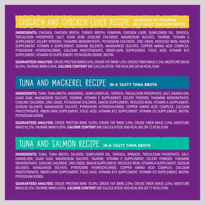 Atún y Salmón: Atún, caldo de atún, salmón, aceite de girasol, tapioca, espinacas, fosfato tricálcico, sal, diente de león, goma guar, sulfato de magnesio, taurina, suplemento de vitamina E, apio en polvo, mononitrato de tiamina, cloruro de colina, óxido de zinc, suplemento de niacina, hierro reducido, suplemento de vitamina A, selenito de sodio, sulfato de manganeso, clorhidrato de piridoxina, complejo de aminoácidos de cobre, pantotenato de calcio, suplemento de riboflavina, ácido fólico, suplemento de vitamina B12, suplemento de vitamina D3, biotina, yoduro de potasio.
