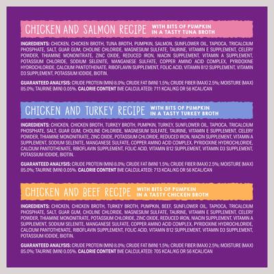 Pollo y carne: Pollo, caldo de pollo, caldo de pavo, calabaza, carne de res, aceite de girasol, tapioca, fosfato tricálcico, sal, goma guar, cloruro de colina, sulfato de magnesio, taurina, suplemento de vitamina E, apio en polvo, mononitrato de tiamina, cloruro de potasio, óxido de zinc, hierro reducido, suplemento de niacina, suplemento de vitamina A, selenito de sodio, sulfato de manganeso, complejo de aminoácidos de cobre, clorhidrato de piridoxina, pantotenato de calcio, suplemento de riboflavina, ácido fólico, suplemento de vitamina B12, suplemento de vitamina D3, yoduro de potasio, biotina