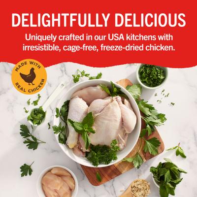 - Natural treats help to clean teeth, fur-eshen breath, and offer the paw-some taste of freeze-dried, cage-free chicken.