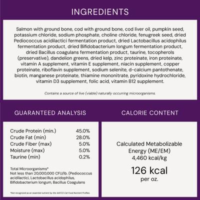Salmon with ground bone, cod with ground bone, cod liver oil, pumpkin seed, potassium chloride, sodium phosphate, choline chloride, fenugreek seed, dried Pediococcus acidilactici fermentation product, dried Lactobacillus acidophilus fermentation product, dried Bifidobacterium longum fermentation product, dried Bacillus coagulans fermentation product, taurine, tocopherols (preservative), dandelion greens, dried kelp, zinc proteinate, iron proteinate, vitamin A supplement, vitamin E supplement, niacin supplement, copper proteinate, riboflavin supplement, sodium selenite, d-calcium pantothenate, biotin, manganese proteinate, thiamine mononitrate, pyridoxine hydrochloride, vitamin D3 supplement, folic acid, vitamin B12 supplement.
