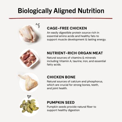 - Raw, cage-free chicken and nutrient-rich organs and bone provide a high-quality protein source for your cat.