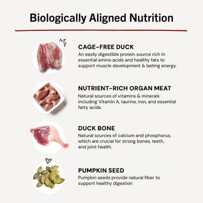 Duck With Ground Bone, Turkey With Ground Bone, Turkey Liver, Goose, Turkey Gizzard, Pumpkin Seed, Potassium Chloride, Sodium Phosphate, Choline Chloride, Dried Pediococcus Acidilactici Fermentation Product, Dried Lactobacillus Acidophilus Fermentation Product, Dried Bifidobacterium Longum Fermentation Product, Dried Bacillus Coagulans Fermentation Product, Taurine, Tocopherols (Preservative), Dandelion Greens, Dried Kelp, Zinc Proteinate, Iron Proteinate, Vitamin A Supplement, Vitamin E Supplement, Niacin Supplement, Copper Proteinate, Riboflavin Supplement, Sodium Selenite, D-Calcium Pantothenate, Biotin, Manganese Proteinate, Thiamine Mononitrate, Pyridoxine Hydrochloride, Vitamin D3 Supplement, Folic Acid, Vitamin B12 Supplement. Contains A Source Of Live Naturally Occurring Microorganisms.