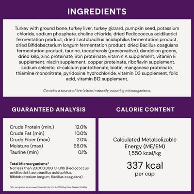 Turkey With Ground Bone, Turkey Liver, Turkey Gizzard, Pumpkin Seed, Potassium Chloride, Sodium Phosphate, Choline Chloride, Dried Pediococcus Acidilactici Fermentation Product, Dried Lactobacillus Acidophilus Fermentation Product, Dried Bifidobacterium Longum Fermentation Product, Dried Bacillus Coagulans Fermentation Product, Taurine, Tocopherols (Preservative), Dandelion Greens, Dried Kelp, Zinc Proteinate, Iron Proteinate, Vitamin A Supplement, Vitamin E Supplement, Niacin Supplement, Copper Proteinate, Riboflavin Supplement, Sodium Selenite, D-Calcium Pantothenate, Biotin, Manganese Proteinate, Thiamine Mononitrate, Pyridoxine Hydrochloride, Vitamin D3 Supplement, Folic Acid, Vitamin B12 Supplement. Contains A Source Of Live (Viable) Naturally Occurring Microorganisms.