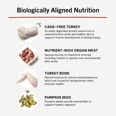 - Made with 98% cage-free turkey, organs, and bone for a high-protein, nutrient-rich meal.