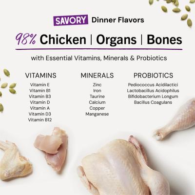 Pollo (molido con hueso), hígado de pollo, molleja de pollo, semilla de calabaza, cloruro de potasio, fosfato de sodio, cloruro de colina, semilla de fenogreco, producto de fermentación de Pediococcus Acidilactici seco, producto de fermentación de Lactobacillus Acidophilus seco, producto de fermentación de Bifidobacterium Longum seco, producto de fermentación de Bacillus Coagulans seco, taurina, tocoferoles (conservante), hojas de diente de león, sal, algas marinas secas, proteinato de zinc, proteinato de hierro, suplemento de vitamina A, suplemento de vitamina E, suplemento de niacina, proteinato de cobre, suplemento de riboflavina, selenito de sodio, pantotenato de D-calcio, biotina, proteinato de manganeso, mononitrato de tiamina. Clorhidrato de piridoxina, suplemento de vitamina D3, ácido fólico, suplemento de vitamina B12.
