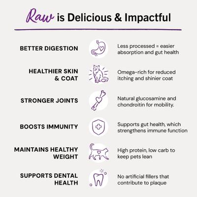 - Añadir nutrición cruda a la dieta de tu mascota puede ayudar a mejorar su apetito y digestión, aliviar los síntomas de la alergia, promover dientes y encías saludables, aumentar su resistencia y fortalecer su sistema inmunitario.