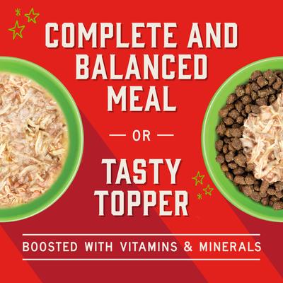 - Paw-fect as a topper or a complete and balanced meal, this recipe comes in easy-to-open pouches that are great for on-the-go adventures!