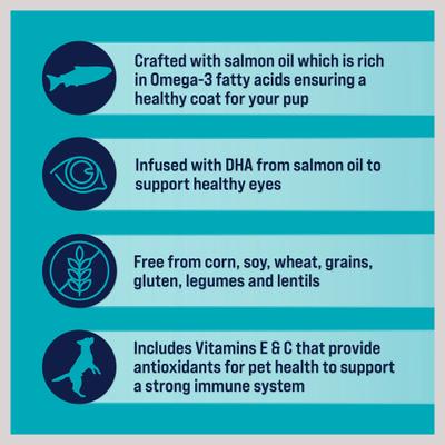 - Treats are made with salmon oil and vitamins E and C to support your furbaby’s immune health.