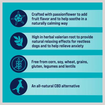 - These calming treats may help relieve your furbaby’s stress or separation anxiety and are made with naturally calming passionflower and valerian root to promote stress relief.
