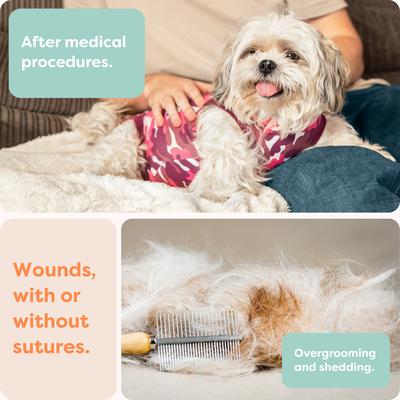 • El ajuste ceñido con cierre trasero evita que la mascota se mueva; Se puede retraer para ir al baño. Las áreas cubiertas se mantienen limpias y secas, lo que evita que las bacterias y la suciedad provoquen infecciones. Fabricado con un tejido no tóxico, transpirable y elástico en 4 direcciones, lavable a máquina para su reutilización. Permite la circulación del aire alrededor de la herida para su cicatrización, con bolsillos integrados para gasas. Permita que su perro se recupere con comodidad y dignidad con el traje de recuperación Suitical para perros. Una alternativa preferida por los perros al temido cono de la vergüenza, este nuevo enfoque ofrece una gran cantidad de ventajas. Mientras que los conos tradicionales restringen el movimiento normal y distraen su sentido de la orientación, el traje de recuperación resuelve todos estos problemas y más. Al actuar como una segunda piel, permite a su perro continuar con su rutina normal, manteniendo la herida limpia, seca y protegida. Todo esto se traduce en menos estrés, una recuperación más rápida y una mascota más feliz. Pregúntate: ¿te gustaría usar un cono?