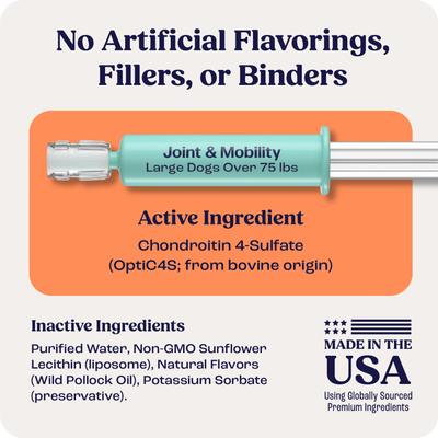Chondroitin 4-Sulfate (OptiC4S from Bovine Origin) Purified Water, Non-GMO Sunflower Lecithin (Liposome), Natural Flavors (Wild Pollock Oil), Potassium Sorbate (Preservative).