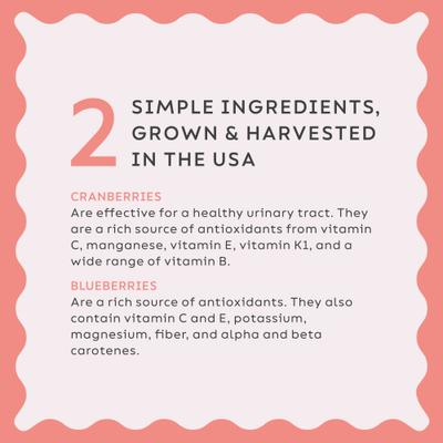 - Made with cranberries and wild blueberries, which are high in antioxidants and which help to protect the walls of the bladder and urinary tract.