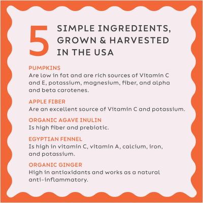 - Contains just 5 simple, antibiotic-free ingredients—pumpkin, apple, fiber, fennel, organic agave inulin and organic ginger. They are GMO free, pesticide free and have no added hormones.