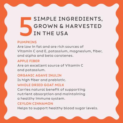 - Made with whole goat milk, pumpkin, apple fiber, organic agave inulin and Ceylon cinnamon.