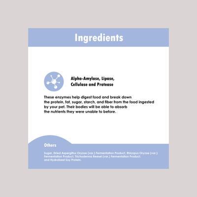 - Features alpha-amylase, lipase, cellulase and protease—these enzymes work to break down the protein, fat, sugar, starch and fiber from your pet’s food, which may help improve nutrient absorption.