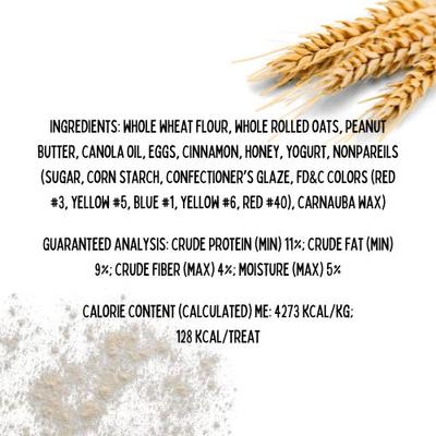 Whole Wheat Flour, Whole Rolled Oats, Peanut Butter, Canola Oil, Eggs, Cinnamon, Honey, Yogurt, Nonpariels (Sugar, Corn Starch, Confectioners Glaze, Fd&C Colors (Red #3, Yellow #5, Blue #1, Yellow #6, Red #40), Carnauba Wax)