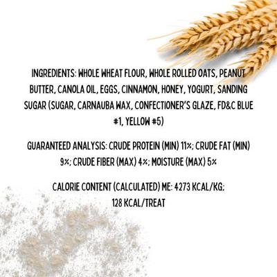 Whole Wheat Flour, Whole Rolled Oats, Peanut Butter, Canola Oil, Eggs, Cinnamon, Honey, Yogurt, Sanding Sugar (Sugar, Confectioners Glaze, Carnauba Wax, Blue #1, Yellow #5)