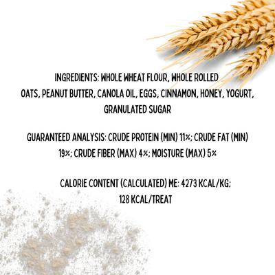 Whole Wheat Flour, Whole Rolled Oats, Peanut Butter, Canola Oil, Eggs, Cinnamon, Honey,Yogurt, Granulated Sugar.