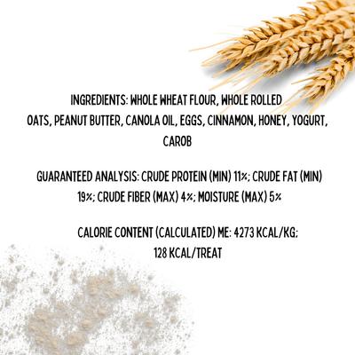 Whole Wheat Flour, Whole Rolled Oats, Peanut Butter, Canola Oil, Eggs, Cinnamon, Honey, Yogurt, Carob.