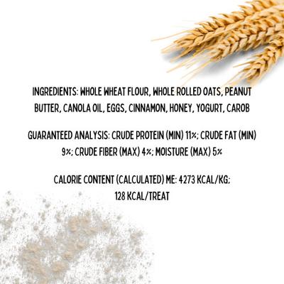 Whole Wheat Flour, Whole Rolled Oats, Peanut Butter, Canola Oil, Eggs, Cinnamon, Honey, Yogurt, Carob.