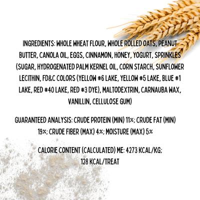 Whole Wheat Flour, Whole Rolled Oats, Peanut Butter, Canola Oil, Eggs, Cinnamon, Honey, Yogurt.