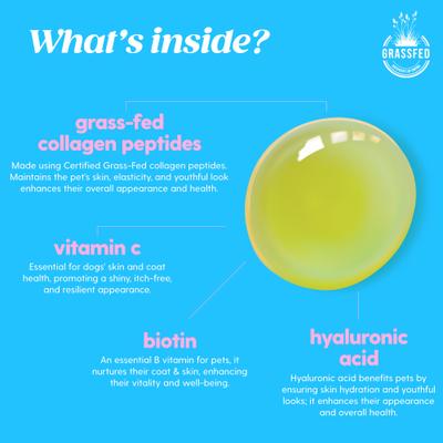 - Advanced formula combines the power of grass-fed collagen peptides, biotin, vitamin C, and hyaluronic acid to promote your furry friend’s skin and coat health.
